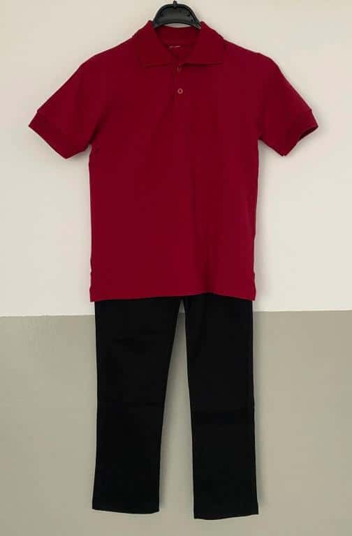 *Üst:* Herhangi bir logo veya işaret içermeyen bordo renkli uzun veya kısa kollu yakalı tişört.